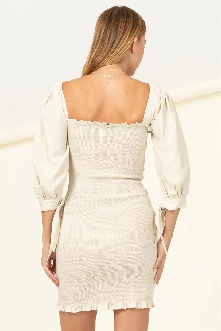 🖤 Features: smocked, see-through design, 3/4 puff sleeves with tie , square ruffle neck line, bodycon fit, mini length, taupe camel color.