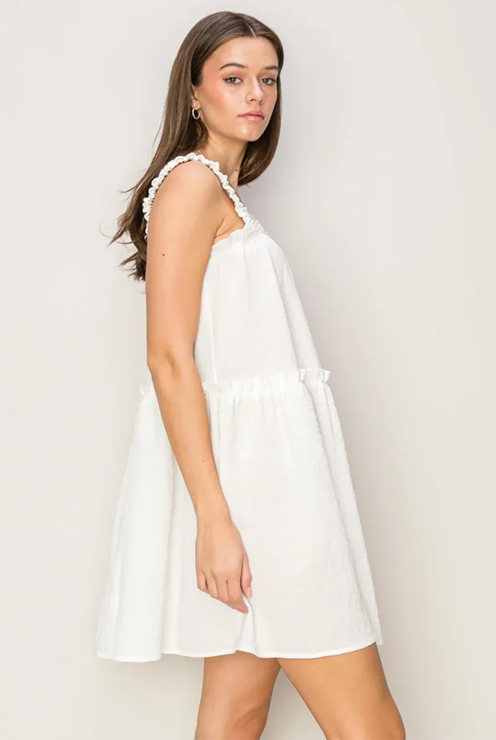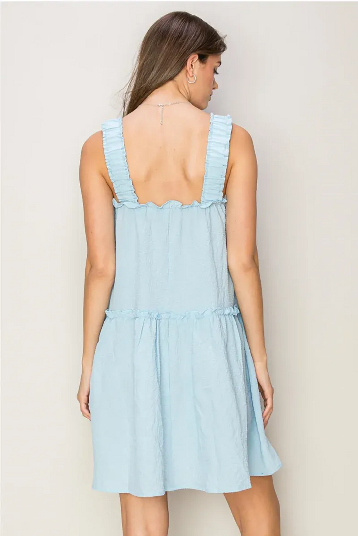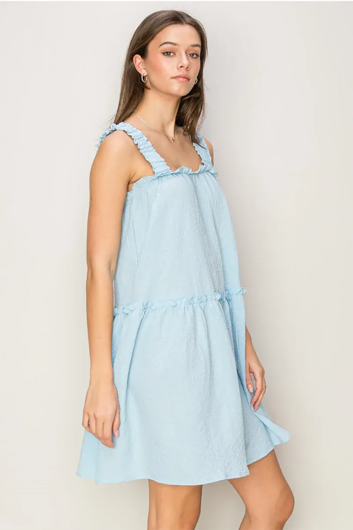 This Tiered Ruffle Ruched Strap Sleeveless Mini Dress combines elegance and playfulness, making it a perfect addition to any wardrobe. The dress features a flattering ruched design that accentuates the figure, while the tiered ruffle detailing adds a touch of whimsy. Its sleeveless cut ensures comfort and breathability, ideal for warm weather occasions. Versatile enough for both casual outings and more formal events, this mini dress can be easily styled with accessories to create a variety of looks.