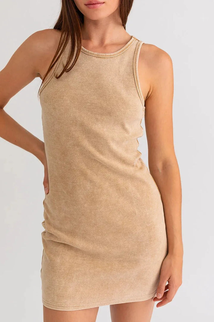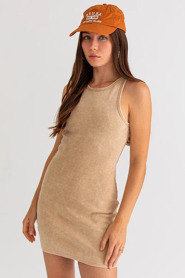 Women dress: sleeveless, binding tank, mini length, soft, washed rib, basic, summer dress. This dress has a soft, vintage-inspired vibe that adds a touch of cool, casual charm. Whether dressed up with heels or kept casual with sneakers, this mini dress is a versatile wardrobe staple that exudes understated chic.
