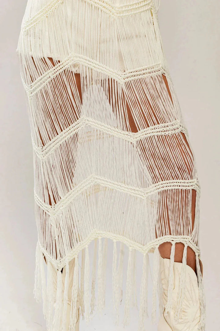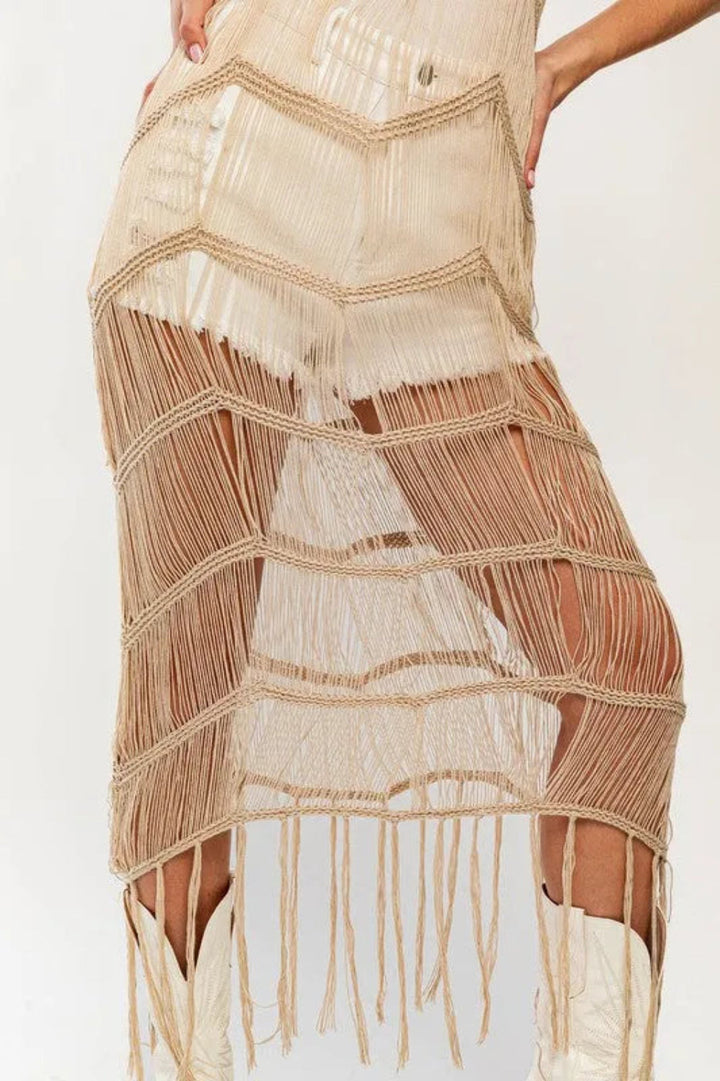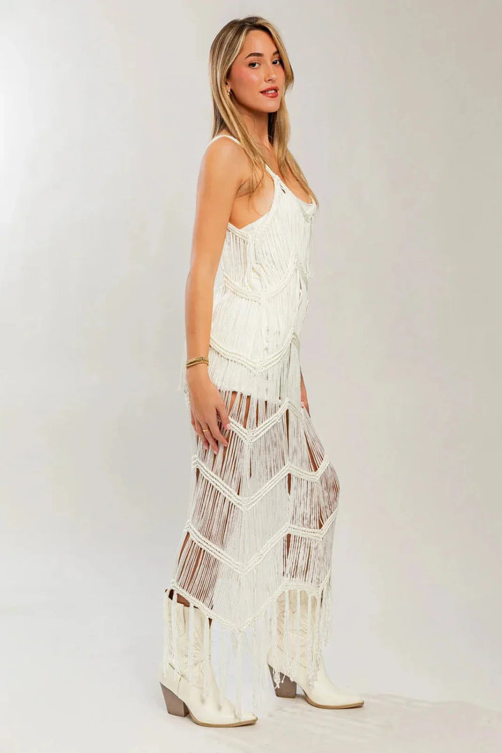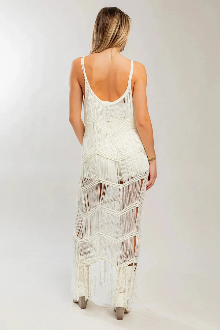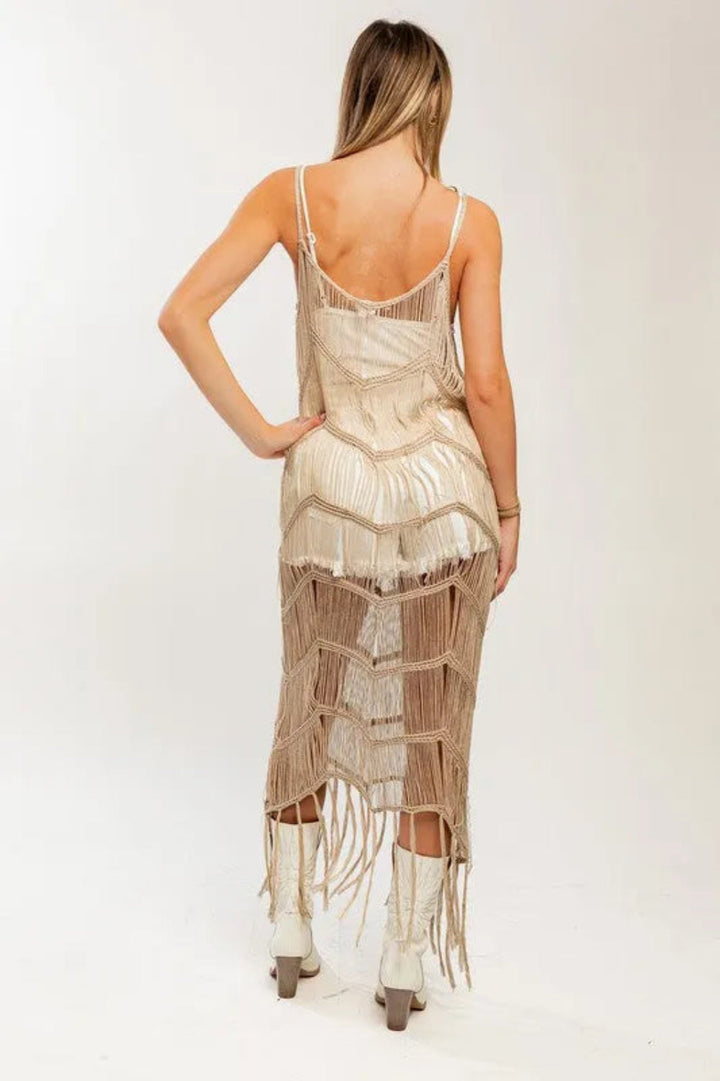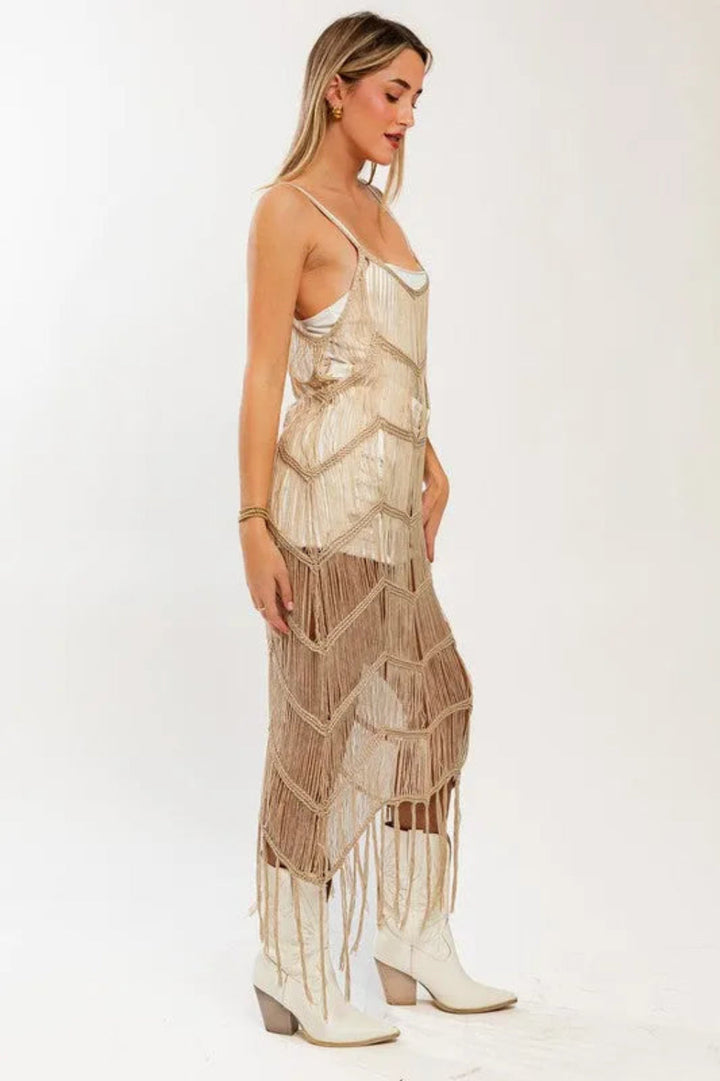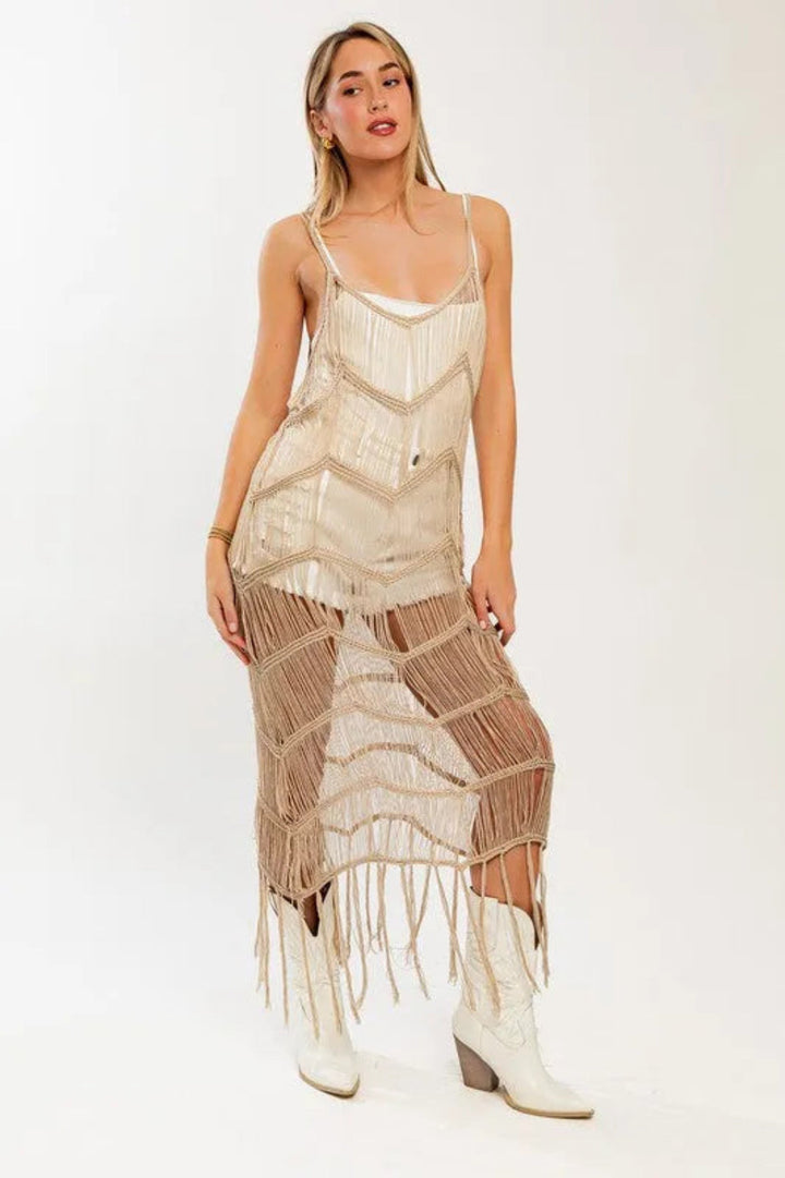 Make a statement in your boutique with our show-stopping bohemian fringe dress and beach cover up! This versatile western-inspired maxi and resort caftan features an eye-catching chevron pattern with delicate fringe details that create mesmerizing movement with every step. Perfect for boutique owners looking to bring that coveted festival-ready style and luxury resort wear to their fashion-forward customers.