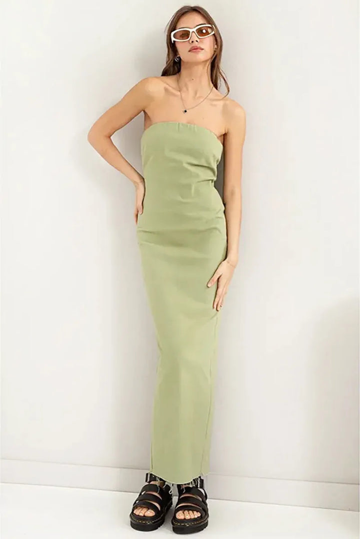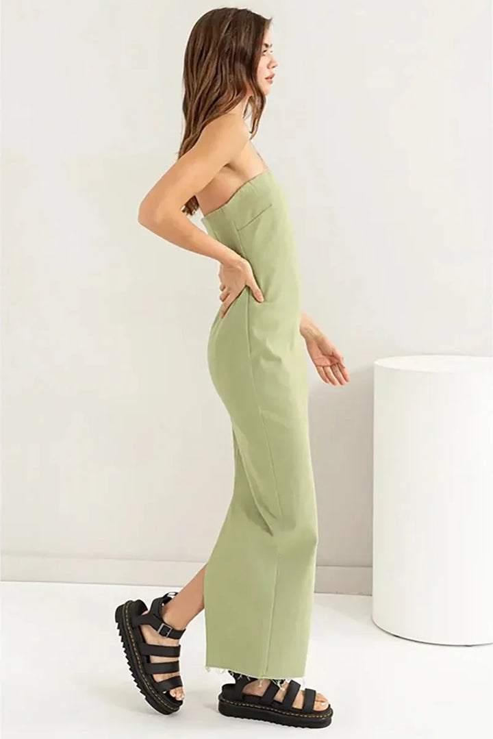 Minimalist Raw Hem Strapless Back Slit Column Tube Maxi Dress