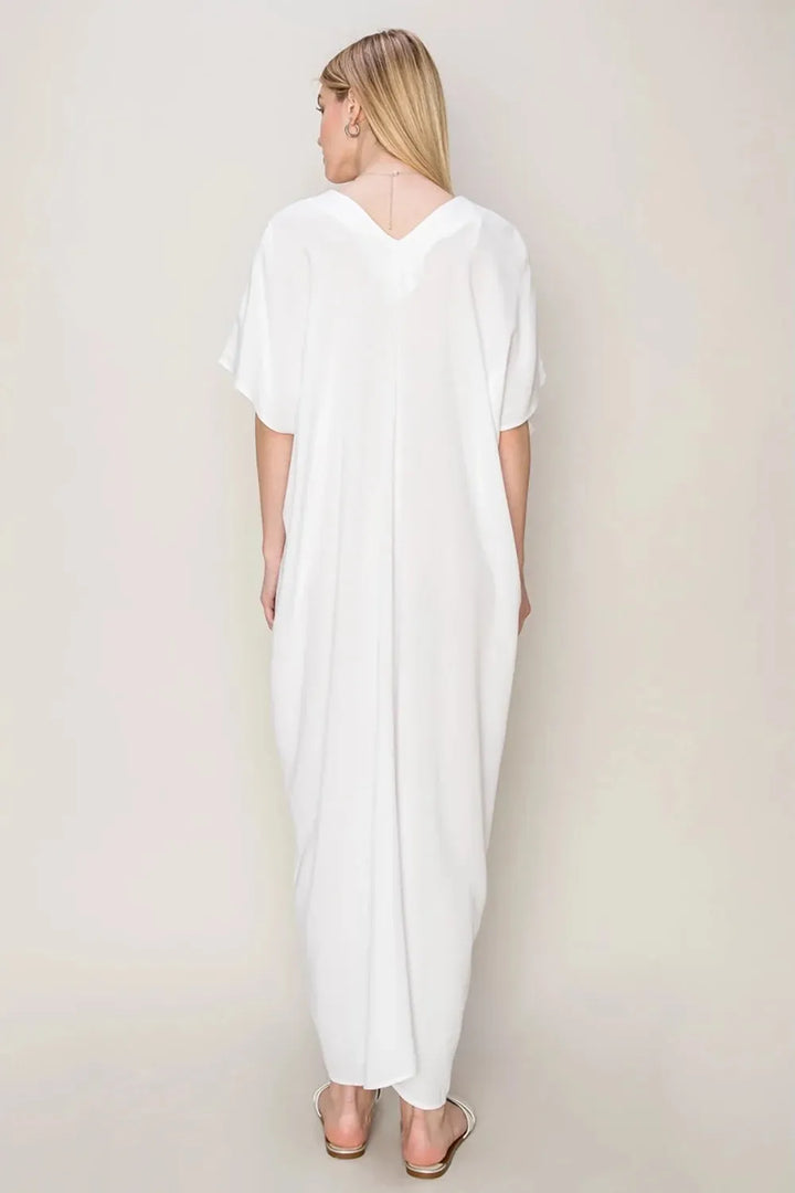 🖤 Features: Soft, luxurious fabric, oversized dolman sleeves, flattering V-neckline front and back, relaxed fit, breezy kaftan silhouette, ankle-length design, premium quality, easy-care material, timeless white color