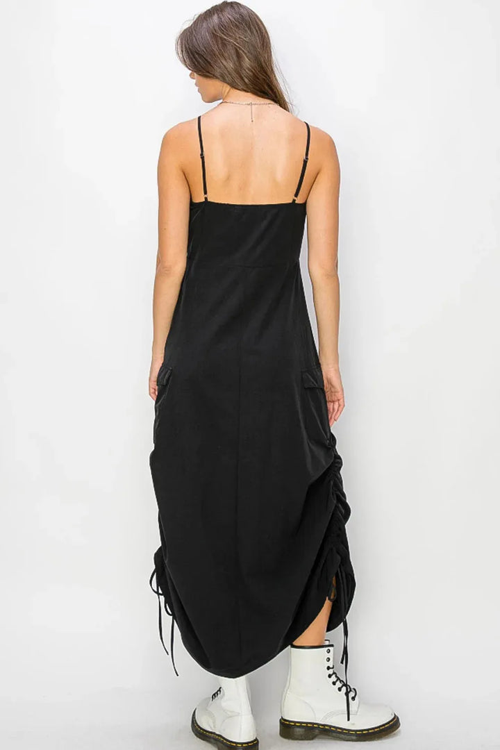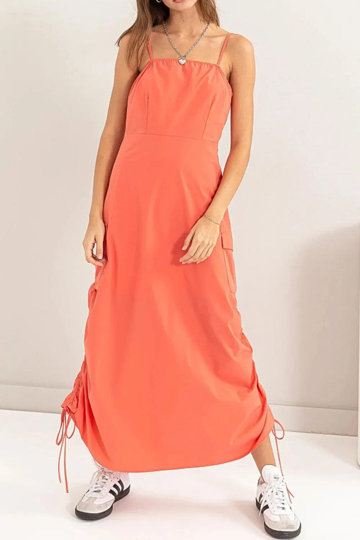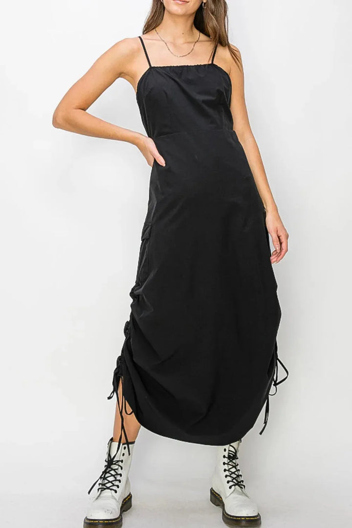 Streetwear Sleeveless Side Ruched Midi Cargo Dress